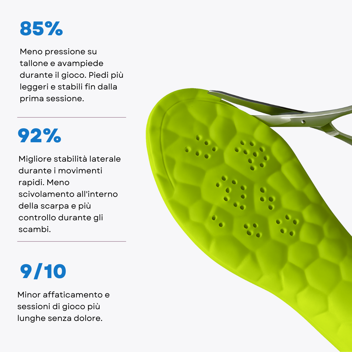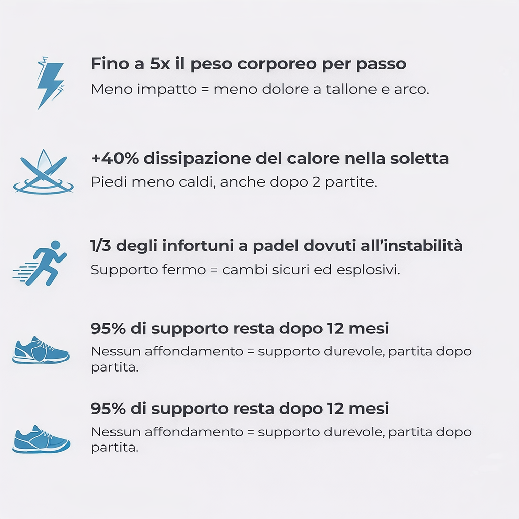 A differenza delle solette standard, queste sono progettate specificamente per il padel: offrono maggiore stabilità laterale, migliore assorbimento degli urti e supporto duraturo anche dopo mesi di utilizzo.